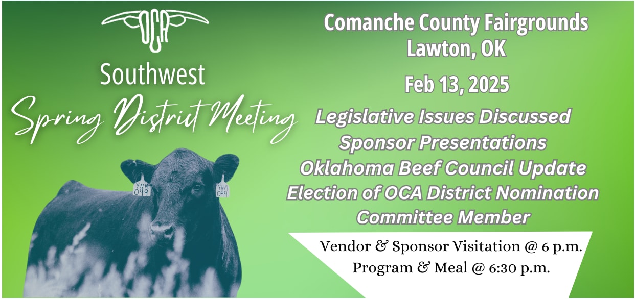 Vendor & Sponsor Visitation @ 6 p.m. Program & Meal @ 6:30 p.m. Legislative Issues Discussed Sponsor Presentations Oklahoma Beef Council Update Election for OCA District Nomination Committee MemberImages